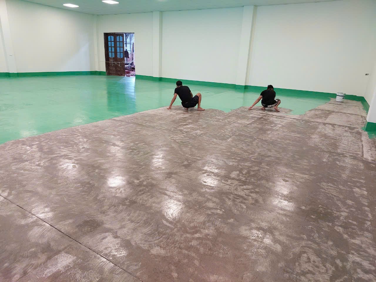 Thi công lớp sơn lót: Sử dụng sơn epoxy lót chuyên dụng giúp tăng độ bám và ngăn ẩm cho nền bê tông.
